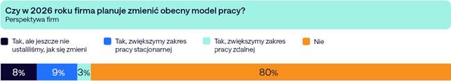 - 20 proc. firm planuje zmienić w tym roku obecnie funkcjonujący model pracy. Największy odsetek z nich (9 proc.) planuje zwiększyć zakres pracy stacjonarnej. Tylko 3 proc. chce postawić na częstszą pracę zdalną.
