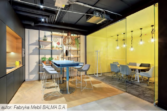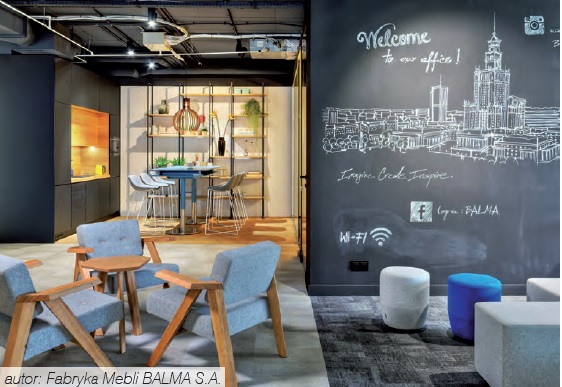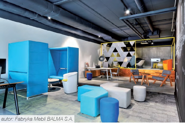Projektanci działający zgodnie z metodologią Activity Based Working opracowaną przez holenderskie biuro Veldhoen& Company, którego ekspertem jest Louis Lhoest wychodzą z założenia, że to sami pracownicy najlepiej wiedzą, czego w danym momencie im potrzeba. Należy więc, przyjmując ogólne założenia bazujące na wiedzy o specyfice działania organizacji, zapewnić im przestrzeń, w której poczują się komfortowo. Przykładem realizacji nowoczesnych trendów zgodnych z ideą Activity Based Working, a także metodologii pracy projektowej Design Thinking nastawionych na definiowanie realnych potrzeb użytkowników jest system mebli biurowych Balma PLUS, system mebli biurowych Balma PLUS, będący efektem współpracy specjalistów z dziedziny zarządzania organizacją, projektantów, niezależnych ekspertów. Pracę mulidyscyplinarnego zespołu przełożył na język designu duet projektantów Wiktoria Lenart i Piotr Kuchciński. Balma PLUS składa się z modułów, które można dowolnie zestawić dopasowując do potrzeb użytkowników. Pozwala projektować przestrzeń multifunkcjonalną – do pracy indywidualnej i zespołowej, do spotkań formalnych i pracy kreatywnej oraz odpoczynku i rozwijania relacji między pracownikami. To pomysł na elastyczne biuro dające możliwość szybkiej zmiany przestrzeni w zależności od sposobu pracy. Istotnym elementem systemu Balma PLUS są biurka, których wysokość jest regulowana elektrycznie. Ich ustawieniem można sterować z komputera, za pomocą aplikacji, poprzez złącze USB, a nawet za pomocą smarfonu. Pomocna aplikacja podpowiada kiedy – zgodnie z zasadami ergonomii – powinniśmy wstać i zmienić pozycję pracy z siedzącej na stojącą. Podnoszenie biurka mobilizuje do rozprostowania układu mięśniowo-szkieletowego, co ma pozytywny wpływ na kondycję użytkownika, a w rezultacie na jego efektywność. Zestawione biurka mogą tworzyć przestrzeń do wspólnej pracy, a po jej zakończeniu błyskawicznie zmienić się w odrębne, odseparowane stanowiska do czego służą deflektory akustyczne będące jednym z głównych elementów systemu Balma PLUS. Kostrukcja sprawia, że są lekkie, a zamontowane do blatu biurka pozwalają na szybkie ustawienie w dowolnej pozycji. Do stworzenia jeszcze bardziej intymnej przestrzeni służą mobilne tapicerowane parawany w różnych wariantach kolorystycznych. Z jednej strony dają warunki do komfortowej pracy wymagającej skupienia się i koncentracji, a z drugiej strony sprawnie organizują prace, gdyż można je wyposażyć w system wiszących półek, koszy i organizerów, by wszystko znalazło się w zasięgu ręki. System pozwala również na aranżowanie alternatywnych miejsc spotkań z wykorzystaniem modułowych sof i foteli, by tworzyć mniej formalne przestrzenie do pracy kreatywnej lub odpoczynku.