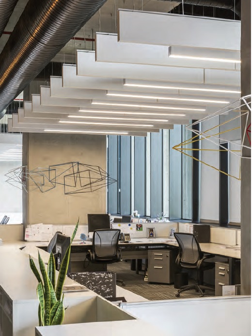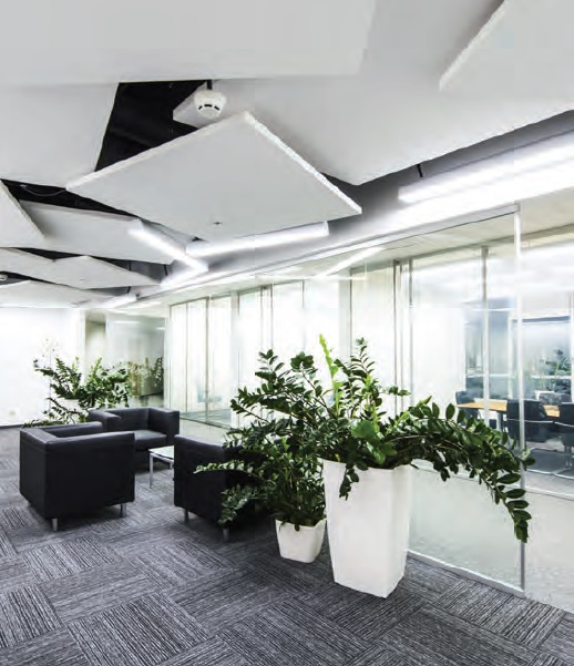 dźwięku (αw > 0,95). W obydwu przypadkach bierzemy pod uwagę pomieszczenie, w którym zastosowano na podłodze wykładzinę dywanową. Jeśli jest to gres, podłoga z żywicy lub innego typu twarde wykończenie, wymagania wobec dźwiękochłonności sufitu lub innych elementów wnętrza będą rosły. Dotyczy to także sytuacji, gdy niedaleko tradycyjnych stanowisk pracy mają być zlokalizowane strefy spotkań ad hoc lub inne źródła zakłóceń