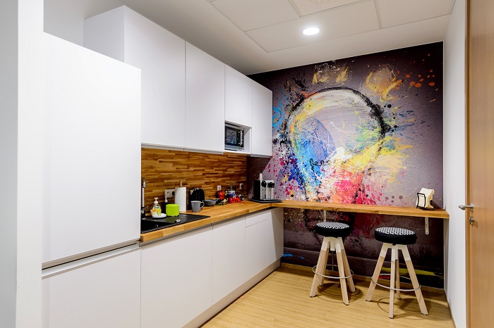 Odzwierciedleniem tego podejścia jest przestrzeń socjalna połączona z kuchnią, którą zdobi pełna koloru fototapeta z żarówką, nawiązująca z przymrużeniem oka do specyfiki działalności firmy. W kuchni pojawiają się też elementy z naturalnego drewna, które tworzą domowy i przytulny charakter. „W projekcie zastosowaliśmy wysokie, fornirowane drzwi, które dodają elegancji i optycznie powiększają przestrzeń” – dodaje Łukasz Kalinowski z Tétris.