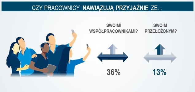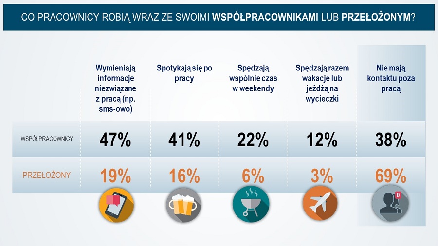 Nieco z większym dystansem podchodzimy natomiast do „przyjacielskich” relacji z szefem. Taką wieź deklaruje tylko 13 proc. ankietowanych. Niemal co trzeci badany (32 proc.) wskazał, że utrzymuje z przełożonym koleżeńskie relacje. Z kolei tylko 19 proc. sms-uje i dzwoni do niego w osobistych sprawach, a 16 proc. spotyka się z nim także poza biurem. Jeszcze mniej, bo niecałe 6 proc. potwierdziło, że spędza z szefem wspólnie czas w weekendy, a 2,7 proc. jeździ razem na wakacje i urlopy. Ponadto, 44 proc. respondentów przyznało, że ich bliscy i znajomi mieli okazję poznać ich przełożonego lub managera.