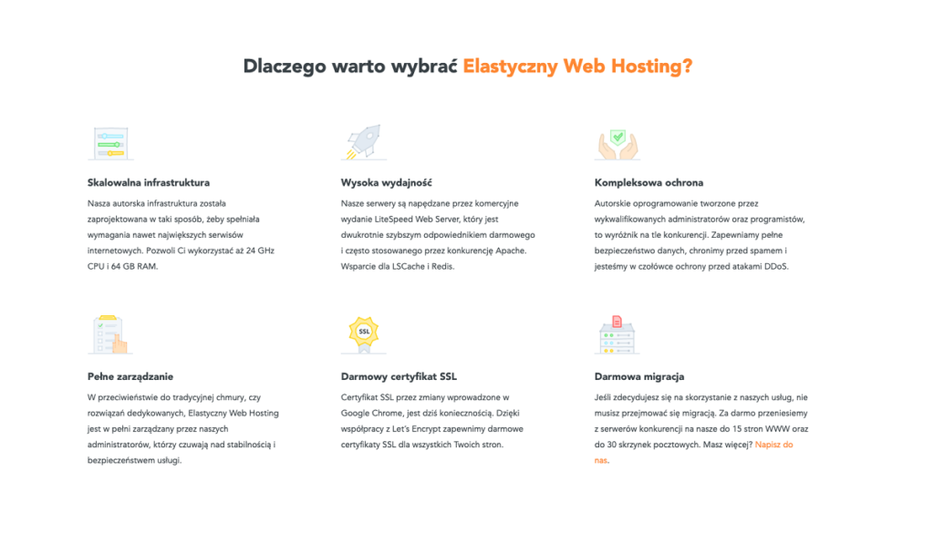 Support chętnie pomaga we wszystkich kwestiach związanych z usługą oraz bardzo sprawnie odpowiada na wszelkie pojawiające się pytania – najczęściej w ciągu 8 minut, 24 godziny na dobę, 7 dni w tygodniu. Podsumowując, Elastyczny Web Hosting to oferta jakiej próżno szukać u innych dostawców hostingu, a skalowanie daje zarówno możliwość dowolnego zwiększania zasobów bez kontaktu z supportem jak i na sprawowania nad nimi całkowitej kontroli.