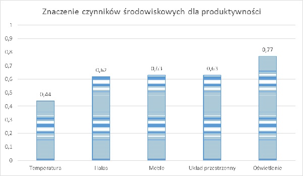 Wykres 1: Znaczenie czynników środowiskowych dla produktywności; na podst. „Impact of Office Design on Employees’ Productivity” (w:) Journal of Public Affairs, Administration and Management; Tom 3, Nr 1, 2009