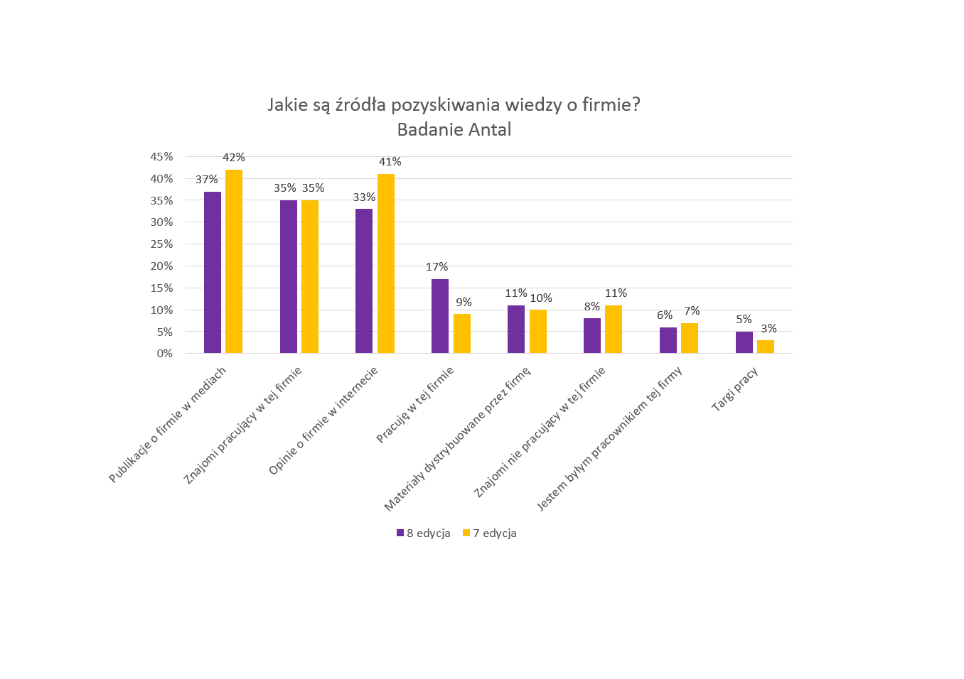 Kandydaci wciąż najchętniej pozyskują informacje o pracodawcach w mediach tradycyjnych (prasa, radio, telewizja) oraz w Internecie – 37 proc. Niewiele mniej, bo 35 proc. respondentów, na temat potencjalnych pracodawców rozmawia ze znajomymi pracującymi w tej firmie. Trzecie miejsce zajmują opinie o firmie umieszczane na portalach społecznościowych oraz forach – 33 proc. To oznacza, że media są dla nas najbardziej wiarygodnym źródłem informacji.