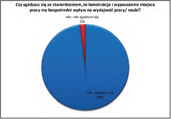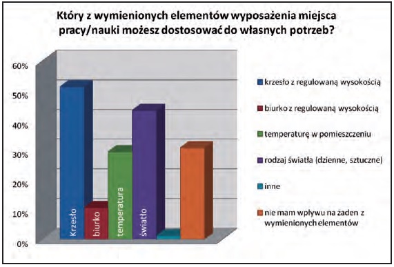 Z badań wynika, że ból częściej dokucza kobietom niż mężczyznom. Tylko 15% kobiet biorących udział w ankiecie twierdzi, że nie odczuwa w pracy dyskomfortu. Wśród mężczyzn to aż 33% ankietowanych. Prawie wszyscy respondenci (98%) przyznają, że konstrukcja i wyposażenie miejsca pracy ma wpływ na jakość ich pracy. Tymczasem z deklaracji badanych osób wynika, że ten element jest zupełnie zaniedbany przez pracodawców. Najwięcej, bo co druga osoba pracująca w biurze ma do dyspozycji krzesło z regulowaną wysokością – 51%. 43% respondentów może również w pracy dostosowywać rodzaj oświetlenia do własnych potrzeb. Jednak już tylko 29 % badanych ma wpływ na temperaturę w pomieszczeniu w którym pracuje, a zaledwie 11% posiada biurko z regulowaną wysokością. Znaczna część osób deklaruje, że nie ma wpływu na żaden z wymienionych elementów wyposażenia miejsca pracy – aż 31%. W badaniu zwrócono uwagę także na relację między wykształceniem pracownika i komfortem jego pracy.