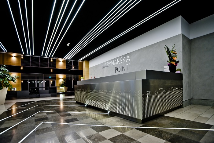 Nie musi być jednak drogo. Metodą na „lifting” holu wejściowego bez ponoszenia gigantycznych wydatków może być użycie obecnego wykończenia w roli stelaża. Na przykład w budynku Marynarska Point 2 nacięliśmy kamienną podłogę, aby zamontować w niej diody pokazujące ciągi komunikacyjne, a w patio (tworzącym „studnię” w środku budynku) zamontowaliśmy wiszące dekoracje, które tworzą świetny efekt.