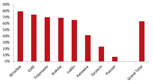 Udział wolumenu umów najmu zawartych przez zagraniczne firmy z sektora usług dla biznesu w wolumenie popytu w największych aglomeracjach poza Warszawą