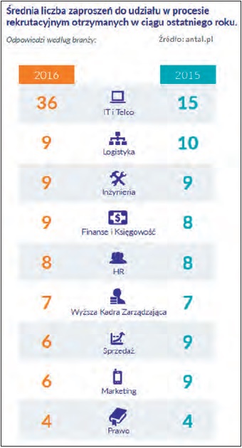 Na celowniku pracodawców byli także logistycy, inżynierowie oraz finansiści i księgowi. Przedstawiciele tych specjalizacji mogli liczyć w 2016 roku na 9 zaproszeń do rozmów o nowych wyzwaniach zawodowych. Średnio osiem propozycji trafiło do ekspertów z obszaru HR. Z wyjątkiem branży informatycznej, liczby rozkładają się podobnie, jak w roku poprzednim.