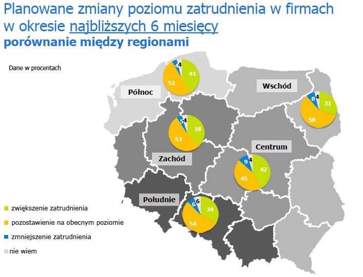Pracodawcy zamierzają tworzyć nowe miejsca pracy, co za tym idzie szukać nowych pracowników i ich zatrudniać (wykres 3). Zasadniczym wyzwaniem będzie jak znaleźć kandydatów, których można przeszkolić przed przystąpieniem do wykonywania zadań zawodowych. Kolejną kwestią będzie przedstawienie im takiej oferty aby skłonni byli podjąć pracę. Przy tej okazji trzeba zwrócić uwagę, na bardzo duże zróżnicowanie geograficzne polskiego rynku praccy. Bezrobocie przekracza w niektórych powiatach 27%, ale zatrudnienie np. w województwie warmińsko-mazurskim jest na poziomie poniżej 50%.